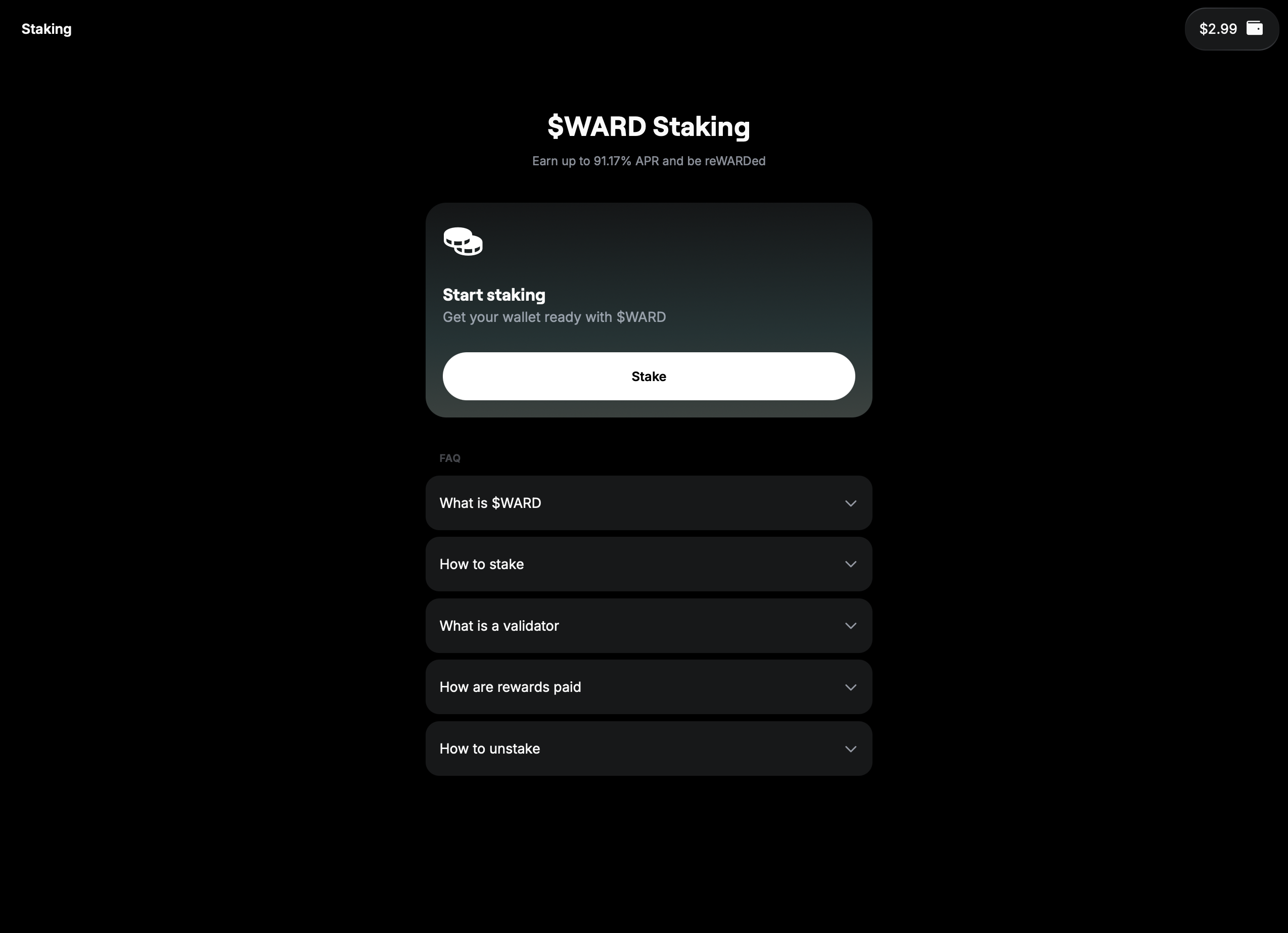 When you stake $WARD, you delegate it to a validator, a network participant responsible for validating blocks and processing transactions. Validators keep the network secure and operational. In return, staking generates rewards as blocks are produced.